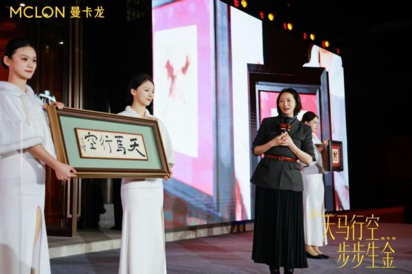 徐悲鸿好意思术馆馆长杨净也携徐悲鸿经典书道作品《天马行空》、画作作品《奔马(得宠)》重磅亮相现场,重现奔马伟貌,并代表徐悲鸿好意思术馆及徐庆平先生,将“天马行空-马年对联”手简作品营救给曼卡龙品牌。