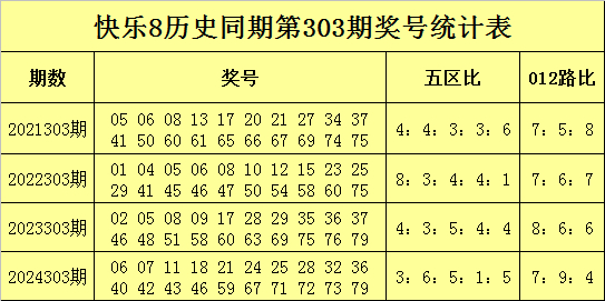 第5-8位号码分析:历史同时第303期出现鸿沟在08-35区段,号码012路比为6:4:6,前年同时开出奖号:21+24+25+28,号码012路比为2:2:0。