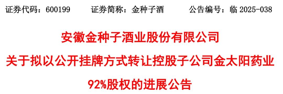 回溯来看,金种子酒剥离金太阳药业的意图额外紧迫。据了解,金种子酒2024年4月脱手了金太阳药业股权转让贪图,2025年8月28日-9月24日初次公开挂牌,以接近1.4亿元的价钱转让其92%股权,但最终流标。
