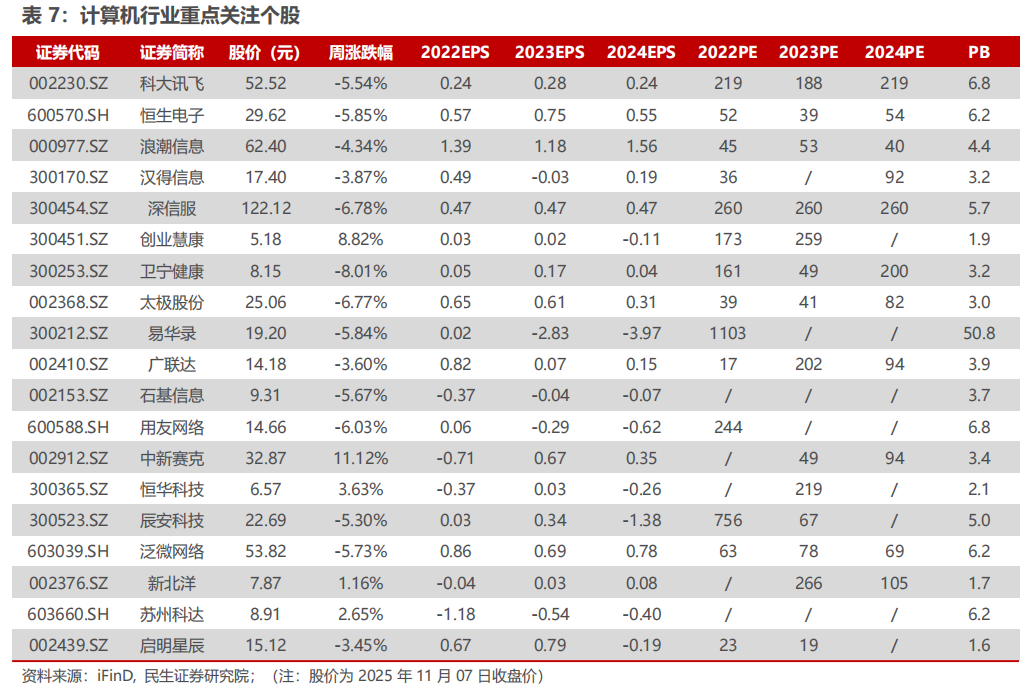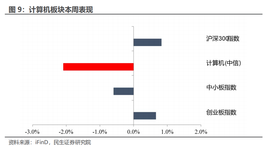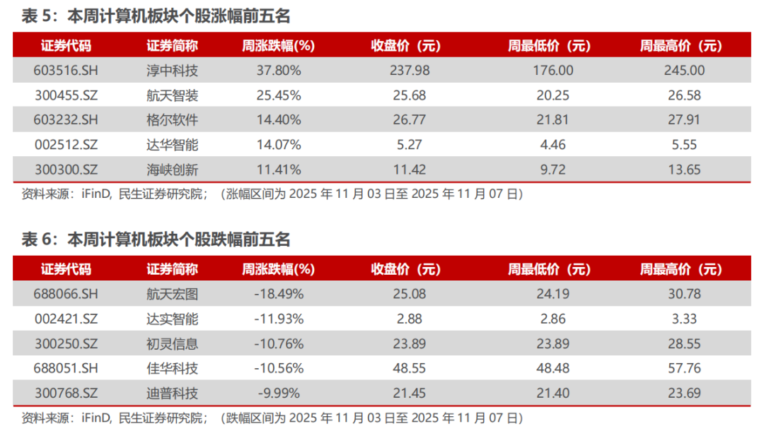 本周(11.03-11.07)沪深300指数高潮0.82%,中小板指数下落0.59%,创业板指数高潮0.65%,诡计机(中信)板块下落2.08%。板块个股涨幅前五名分裂为:淳中科技、航天智装、格尔软件、达华智能(维权)、海峡转变;跌幅前五名分裂为:航天宏图、达实智能、初灵信息(维权)、佳华科技、迪普科技。