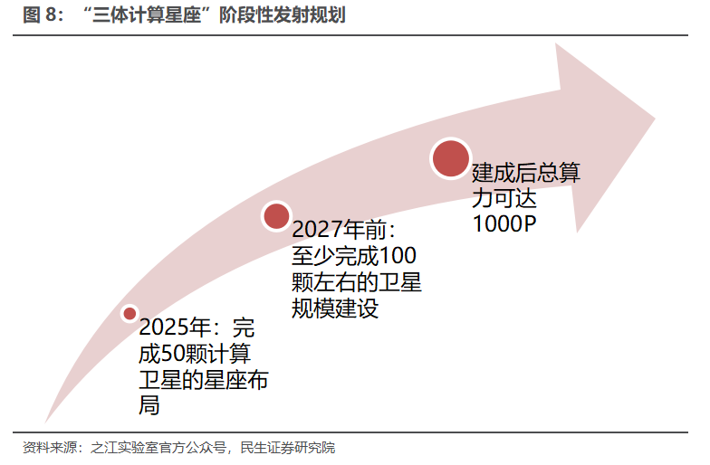 国内空天诡计正在加快发展。1)“星算策画”将助力我国在各人率先建成天外智算基础设施,将由2800颗算力卫星组网,构建将来算力蚁集。2024年9月,国星宇航收效放射各人首颗AI大模子科学卫星,并收效完成卫星在轨运行AI大模子时刻考据。2)三体诡计星座方面,2025年之江实验室将完成超50颗诡计卫星的星座布局,2027年前至少完成100颗傍边的卫星范畴缔造,远期看三体诡计星座建成后总算力可达1000P。3)星缆策画则以构建低时延天基蚁集,径直响应 “东数西算” 工程中数据传输、诡计的时延刚需为主要发展标的,在国内东西部地区算力周折领域具有进军潜力。