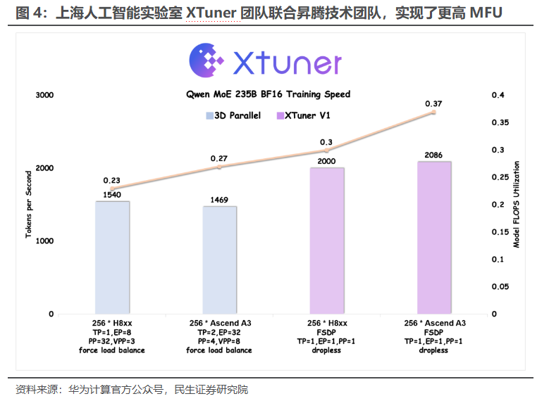 在历练端,上海东说念主工智能实验室XTuner团队麇集昇腾时刻团队在超节点上进行深度优化,充分阁下昇腾384超节点硬件特点,已毕了更高MFU。