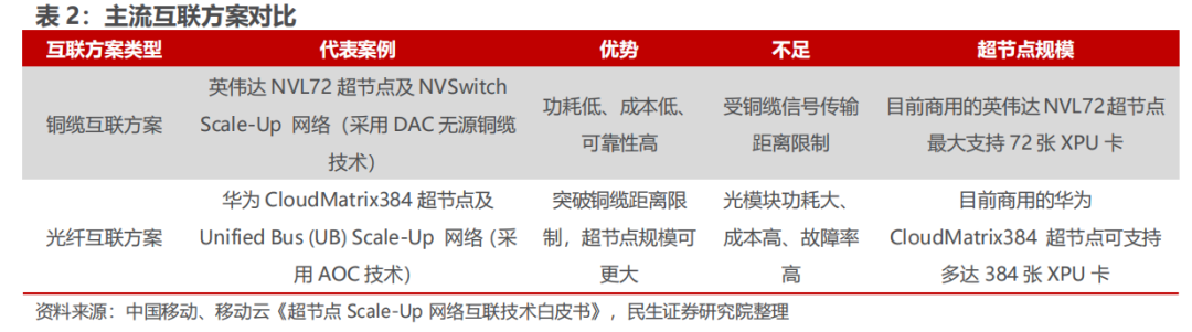 互联决策:主流互联决策分为铜缆互联和光纤互联两大类。铜缆互联决策以英伟达NVL72超节点等为代表,选择DAC无源铜缆时刻,具有功耗低、本钱低、可靠性高的上风,但受铜缆传输距离限定,单个超节点范畴较小,如英伟达NVL72最大扶持72张XPU卡;光纤互联决策以华为CloudMatrix384超节点等为代表,选择AOC时刻,突破了铜缆距离限定,超节点范畴可更大,如华为 CloudMatrix384可扶持384张XPU卡。