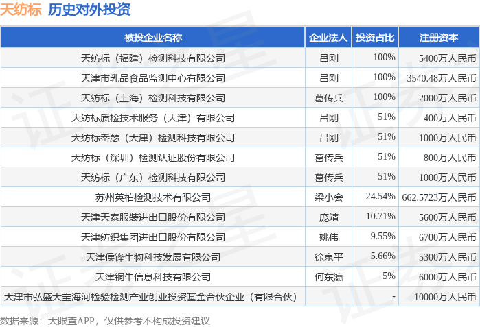 本站音信,把柄天眼查APP知道,天纺标(920753.BJ)新增一说念对外投资事件,被投资公司为天纺标(福建)检测科技有限公司,法定代表东说念主吕刚,投资占比为100%。该公司从事专科时刻就业业,注册成本为5400万东说念主民币。当今北京网上炒股配资网,天纺标共存在对外投资13项,详见下表: